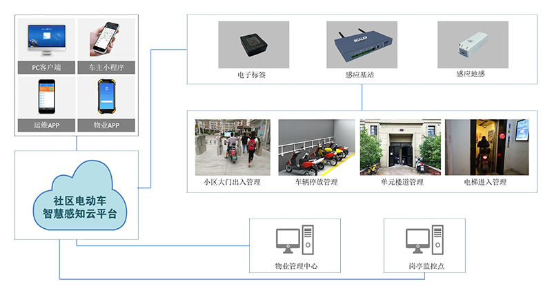 小区电瓶车管理系统由电子标签、基站、地感、云平台、PC web客户端及微信小程序客户端构成。具有技术先进、性能稳定、使用便利、成本低等优点。通过“物联网、大数据、视频分析、云计算”等技术手段来实现电瓶车消防安全防控及交通安全治理,为城市电动自行车管理建立非机动车登记信息库、公共安全射频管控网提供数据支持。
